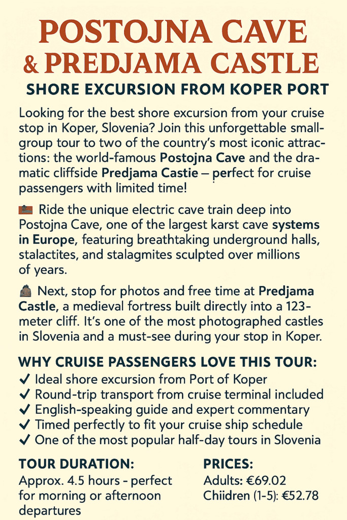 Tour also known as: Postojna cave shore excursion from Koper, Koper to Postojna cave cruise tour, Postojna cave tour for cruise passengers Koper, Postojna cave excursion from koper cruise port, Postojna cave day trip from Koper for cruise guests, Koper Slovenia cruise Postojna cave tour booking, Koper cruise stop Postojna cave guided tour, Postojna cave tour from Koper cheaper than cruise line, Best price Postojna cave excursion from Koper, Short Postojna cave tour from Koper half day, Postojna cave and Predjama castle tour from koper cruise port, Guided Postojna cave experience from Koper, Family friendly Postojna cave tour from koper